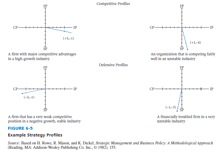 Some example strategy profiles that can emerge from SPACE analysis are shown in Figure 6-5 The directional vector associated with each profile suggests the type of strategies to pursue: aggressive, conservative, defensive, or competitive. Specifically, when a firm’s directional vector is located in the Aggressive Quadrant (upper right) of the SPACE Matrix, an organization is in an excellent position to use its internal strengths to (1) take advantage of external opportunities, (2) overcome internal weaknesses, and (3) avoid external threats. Therefore, market penetration, market development, product development, backward integration, forward integration, horizontal integration, or diversification, can be feasible, depending on the specific circumstances that face the firm.