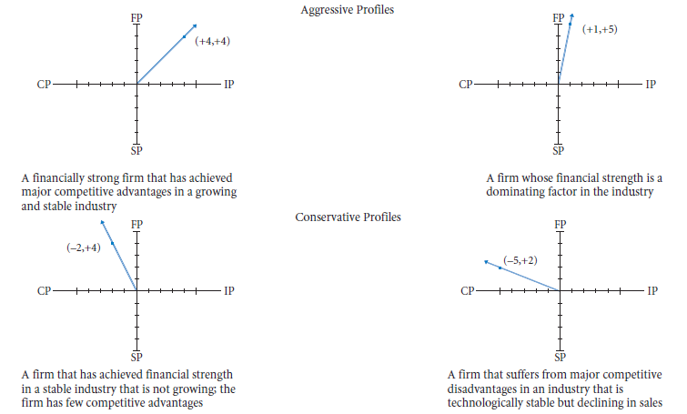 Some example strategy profiles that can emerge from SPACE analysis are shown in Figure 6-5 The directional vector associated with each profile suggests the type of strategies to pursue: aggressive, conservative, defensive, or competitive. Specifically, when a firm’s directional vector is located in the Aggressive Quadrant (upper right) of the SPACE Matrix, an organization is in an excellent position to use its internal strengths to (1) take advantage of external opportunities, (2) overcome internal weaknesses, and (3) avoid external threats. Therefore, market penetration, market development, product development, backward integration, forward integration, horizontal integration, or diversification, can be feasible, depending on the specific circumstances that face the firm.