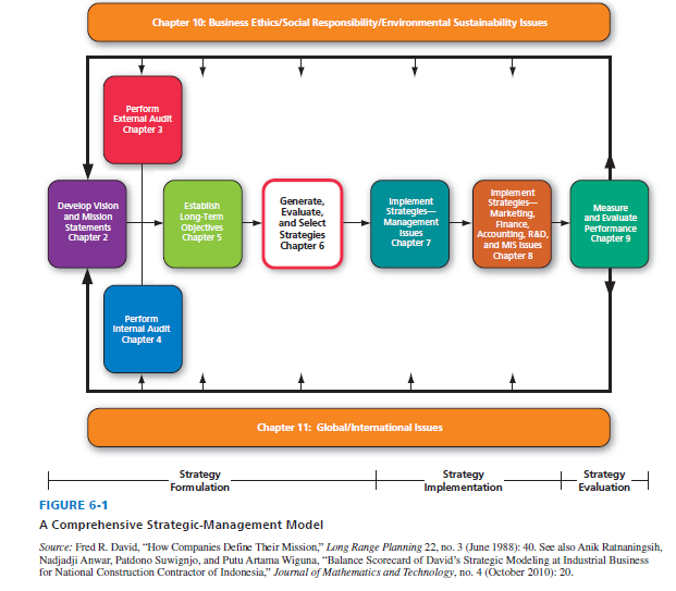 As indicated by Figure 6-1 with white shading, this chapter focuses on generating and evaluating alternative strategies, as well as selecting strategies to pursue. Strategy analysis and choice seek to determine alternative courses of action that could best enable the firm to achieve its mission and objectives. The firm’s present strategies, objectives, vision, and mission, coupled with the external and internal audit information, provide a basis for generating and evaluating feasible alternative strategies. This systematic approach is the best way to avoid an organizational crisis. Rudin’s Law states, “When a crisis forces choosing among alternatives, most people choose the worst possible one.” Unless a desperate situation confronts the firm, alternative strategies will likely represent incremental steps that move the firm from its present position to a desired future position. Alternative strategies do not come out of the wild blue yonder; they are derived from the firm’s vision, mission, objectives, external audit, and internal audit; they are consistent with, or build on, past strategies that have worked well.