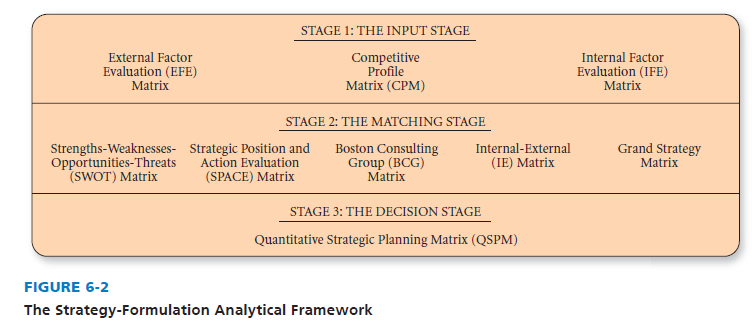 Important strategy-formulation techniques can be integrated into a three-stage decision-making framework, as shown in Figure 6-2. The tools presented in this framework are applicable to all sizes and types of organizations and can help strategists identify, evaluate, and select strategies.