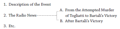 To be more precise, your work plan should include the title, the table of contents, and the introduction. Composing a good title is already a project. I am not talking about the title on the first page of the document that you will deliver to the Registrar’s Office many months from now, one that will invariably be so generic as to allow for infinite variations. I am talking of the “secret title” of your thesis, the one that then usually appears as the subtitle. A thesis may have as its “public” title “Radio Commentary and the Attempted Murder of Palmiro Togliatti,” but its subtitle (and its true topic) will be “Radio Commentators’ Use of Gino Barta- li’s Tour de France Victory to Distract the Public from the Attempted Murder of Palmiro Togliatti.” This is to say that after you have focused on a theme, you must decide to treat only one specific point within that theme. The formulation of this point constitutes a sort of question: has there in fact been a deliberate political use of a sport celebrity’s victory to distract the public from the attempted murder of the Italian Communist Party leader Palmiro Togliatti? And can a content analysis of the radio news commentary reveal such an effort? In this way the secret title (turned into a question) becomes an essential part of the work plan.