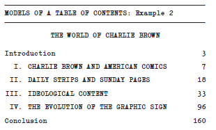 This means that if in the text section 1.2 is a section of chapter 1, you must make this evident in the layout of the table of contents. To clarify, we will provide two models of a table of contents in table 6.4, but you could organize the chapters and sections differently, using Roman and Arabic numerals, letters, etc.