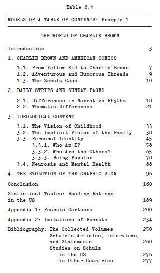 This means that if in the text section 1.2 is a section of chapter 1, you must make this evident in the layout of the table of contents. To clarify, we will provide two models of a table of contents in table 6.4, but you could organize the chapters and sections differently, using Roman and Arabic numerals, letters, etc.
