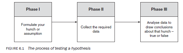 To test a hypothesis you need to go through a process that comprises three phases: (1) constructing a hypothesis; (2) gathering appropriate evidence; and (3) analysing evidence to draw conclusions as to its validity. Figure 6.1 shows this process diagrammatically. It is only after analysing the evidence that you can conclude whether your hunch or hypothesis was true or false. When concluding about a hypothesis, conventionally, you specifically make a statement about the correctness or otherwise of a hypothesis in the form of ‘the hypothesis is true’ or ‘the hypothesis is false’. It is therefore imperative that you formulate your hypotheses clearly, precisely and in a form that is testable. In arriving at a conclusion about the validity of your hypothesis, the way you collect your evidence is of central importance and it is therefore essential that your study design, sample, data collection method(s), data analysis and conclusions, and communication of the conclusions be valid, appropriate and free from any bias.