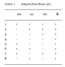 In the columns, DS stands for the distal stimulus; sc stands for the stimulus constellation, namely the energies and the form of transmission, which is studied by optics, acoustics, chemistry, conveying the stimulation from the distal stimulus to the peripheral receptors; PS stands for the proximal stimulus; and $ stands for appearances. The processes, which are supposed to underlie perception, are represented by the concatenation of symbols DS, sc, PS that designate any relevant event in the space and time ruled by the laws of physics and their restriction to physiology. In this sense, ascribing to one of these processes the role of explanatory units of particular phenomena means committing some sort of stimulus error. The symbol “+” means that a perceptual feature is ascribed to that physical or physiological property, namely that a stage of the process that is known or solely conjectured to underlie perception is considered an explanatory constituent of perception, regardless of its being observable or not. This amounts to reducing or explaining away phenomena by the constructs and findings of other sciences. The table represents the possible stimulus errors of the theory of perception, of which only some instances will be exemplified.