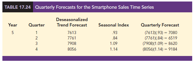 Returning to the smartphone sales example, we have a deseasonalized trend projection for the next four quarters. Now we must adjust the forecast for the seasonal effect. The seasonal index for the first quarter of year 5 (t = 17) is .93, so we obtain the quarterly forecast by multiplying the deseasonalized forecast based on trend (T17 = 7616) by the seasonal index (.93). Thus, the forecast for the next quarter is 7616(.93) = 7083. Table 17.24 shows the quarterly forecast for quarters 17 through 20. The high-volume fourth quarter has a 9188-unit forecast, and the low-volume second quarter has a 6522-unit forecast.