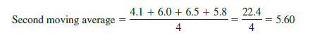 Similarly, the third moving average calculation is (6.0 + 6.5 + 5.8 + 5.2)/4 = 5.875.
