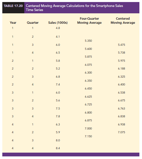The two moving average values we computed do not correspond directly to the original quarters of the time series. We can resolve this difficulty by computing the average of the two moving averages. Since the center of the first moving average is period 2.5 (half a period or quarter early) and the center of the second moving average is period 3.5 (half a period or quarter late), the average of the two moving averages is centered at quarter 3, exactly where it should be. This moving average is referred to as a centered moving average. Thus, the centered moving average for period 3 is (5.35 + 5.60)/2 = 5.475. Similarly, the centered moving average value for period 4 is (5.60 + 5.875)/2 = 5.738. Table 17.20 shows a complete summary of the moving average and centered moving average calculations for the smartphone sales data.
