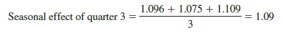 Consider the seasonal-irregular values for the third quarter: 1.096, 1.075, and 1.109. Seasonal-irregular values greater than 1.00 indicate effects above the trend estimate and values below 1.00 indicate effects below the trend estimate. Thus, the three seasonal-irregular values for quarter 3 show an above-average effect in the third quarter. Since the year-to- year fluctuations in the seasonal-irregular values are primarily due to random error, we can average the computed values to eliminate the irregular influence and obtain an estimate of the third-quarter seasonal influence.