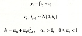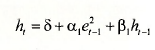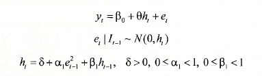 The first equation is the mean equation; it now shows the effect of the conditional variance on the dependent variable. In particular, note that the model postulates that the conditional variance ht affects yt by a factor 0. The other two equations are as before.