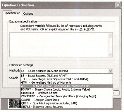 To estimate an ARCH model, click Quick/ Estimate equation and select the ARCH option from the drop-down menu in Method.
