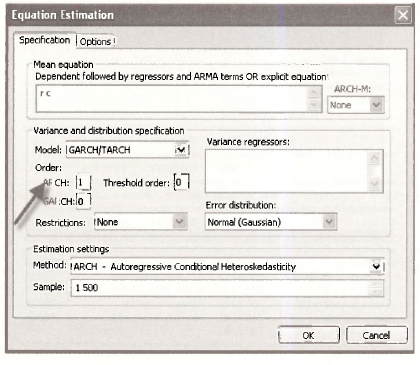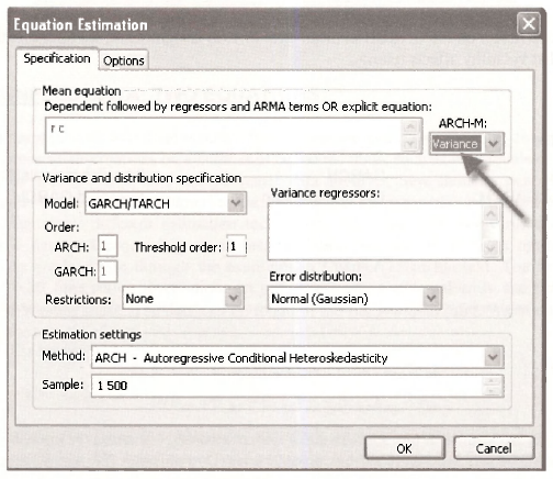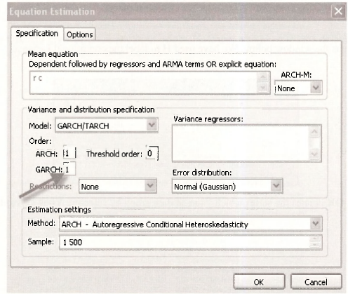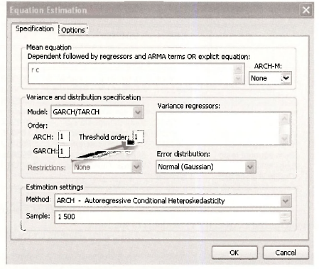 A screen with an upper Mean equation and a lower Variance and distribution specification section will open up. In the mean equation section, enter the regression of the returns, R, on a constant, C. In the variance and distribution specification section, to estimate an ARCH model of order 1, type a 1 against ARCH.