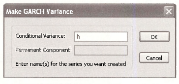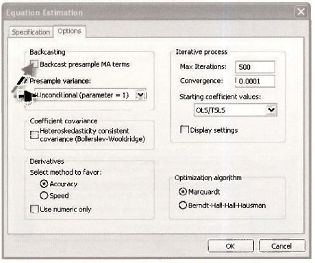 To obtain the standard errors reported in the text, click on Options (top left hand comer) and then pick the options noted below. As discussed in the text, time series models require an initial starting value, in this case the initial variance h.. The options suggested here set the initial variance to the unconditional sample variance.
