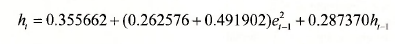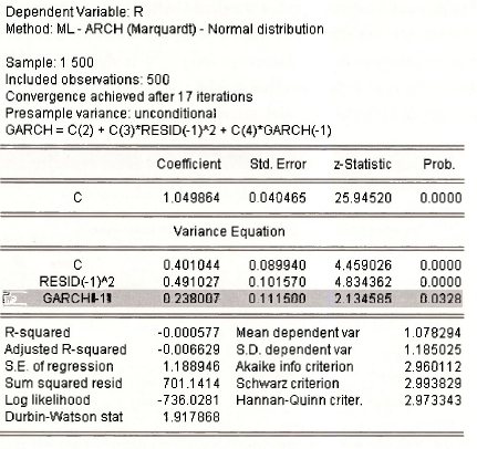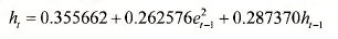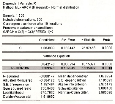 The top section is the mean equation. It shows that the average return is 1.063939. The lower section is the variance equation that gives the result of the ARCH model, namely, that the time varying volatility ht includes a constant component (0.642140) plus a component which depends on past errors. The shaded line highlights the significant ARCH effects.