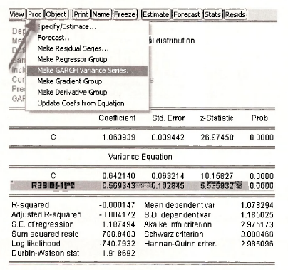 To generate the conditional variance series shown in the text, click on Proc and select Make GARCH Variance Series from the drop-down menu.
