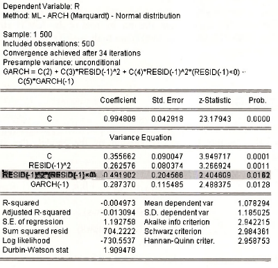 The shaded line in the EViews output shows the significance of the GARCH term. These results show that the volatility coefficients, the one in front of the ARCH effect (0.491027) and the one in front of the GARCH effect (0.238007) are both positive and their sum is between zero and one, as required by theory.