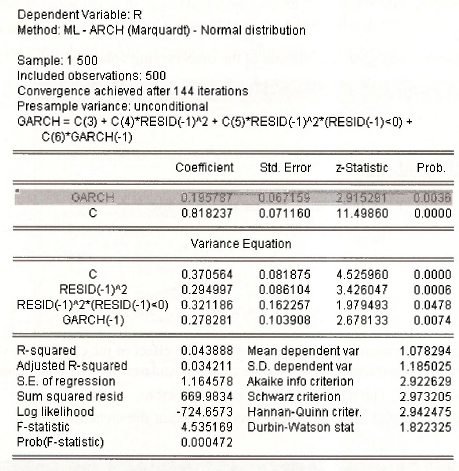 Since the coefficient on the GARCH in mean term (0.196) is significant, we infer that there evidence that volatility affects returns.