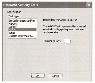 Then select the ARCH option. Inserting 1 in the Number of lags box means that we are testing for ARCH( 1) effects.