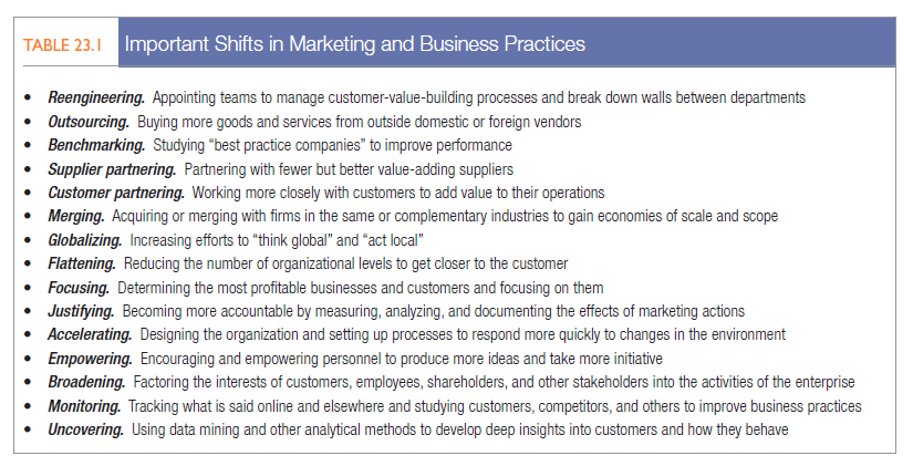 With globalization, deregulation, market fragmentation, consumer empowerment, environmental concerns, and all the remarkable developments in communication technology, the world has unquestionably become a very different place for marketers.2 Table 23.1 summarizes some important shifts in marketing realities.