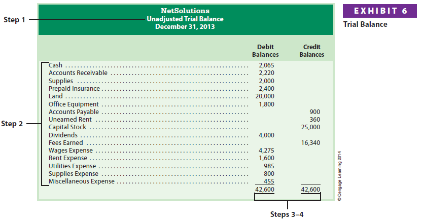 The trial balance for NetSolutions as of December 31, 2013, is shown in Exhibit 6. The account balances in Exhibit 6 are taken from the ledger shown in Exhibit 5. Before a trial balance is prepared, each account balance in the ledger must be determined. When the standard account form is used as in Exhibit 5, the balance of each account appears in the balance column on the same line as the last posting to the account.