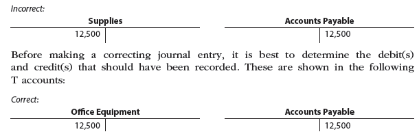 To illustrate, assume that on May 5 a $12,500 purchase of office equipment on account was incorrectly journalized and posted as a debit to Supplies and a credit to Accounts Payable for $12,500. This posting of the incorrect entry is shown in the following T accounts: