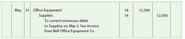 Comparing the two sets of T accounts shows that the incorrect debit to Supplies may be corrected by debiting Office Equipment for $12,500 and crediting Supplies for $12,500. The following correcting entry is then journalized and posted: