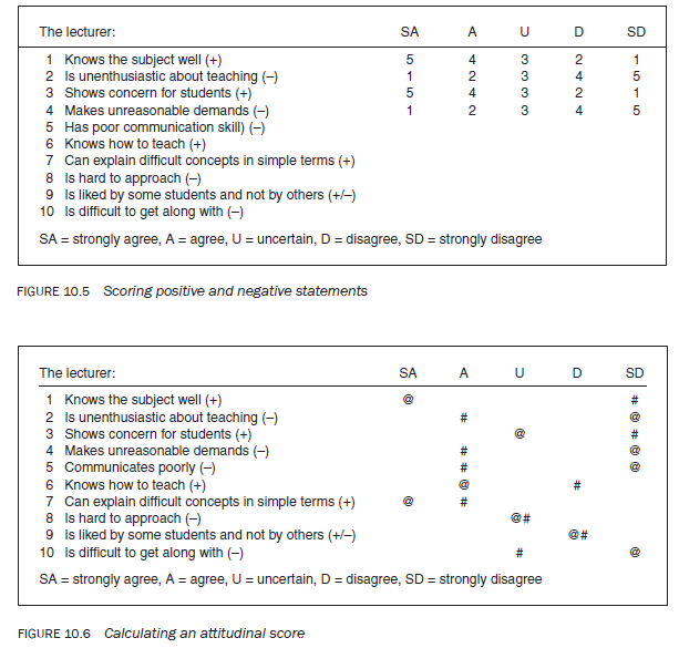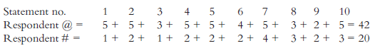 To illustrate how to calculate an individual’s attitudinal score, let us take the example of two respondents who have ticked the different statements marked in our example by # and @ (see Figure 10.6).