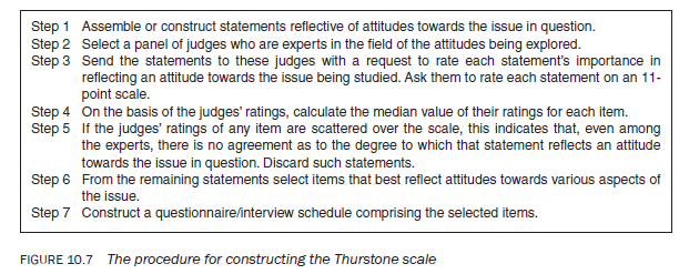 Unlike the Likert scale, the Thurstone scale calculates a ‘weight’ or ‘attitudinal value’ for each statement. The weight (equivalent to the median value) for each statement is calculated on the basis of rating assigned by a group of judges. Each statement with which respondents express agreement (or to which they respond in the affirmative) is given an attitudinal score equivalent to the ‘attitudinal value’ of the statement. The procedure for constructing the Thurstone scale is as given in Figure 10.7.
