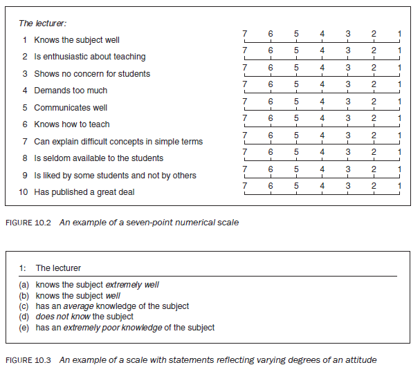 The summated rating scale, more commonly known as the Likert scale, is based upon the assumption that each statement/item on the scale has equal attitudinal value, ‘importance’ or ‘weight’ in terms of reflecting an attitude towards the issue in question. This assumption is also the main limitation of this scale as statements on a scale seldom have equal attitudinal value. For instance, in the examples in Figures 10.1 and 10.2, ‘knowledge of subject’ is not as important in terms of the degree to which it reflects the attitude of the students towards the lecturer as ‘has published a great deal’ or ‘some students like, some do not’, but, on the Likert scale, each is treated as having the same ‘weight’. A student may not bother much about whether a lecturer has published a great deal, but may be more concerned about ‘knowledge of the subject’, ‘communicates well’ and ‘knows how to teach’.