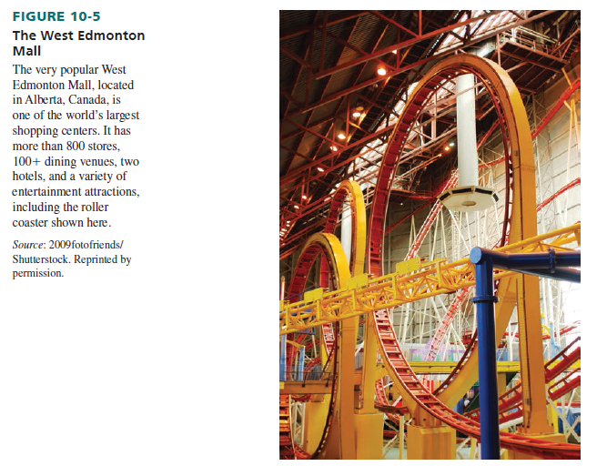 One type of regional center is the megamall, an enormous planned shopping center with 800,000+ square feet of retail space, multiple anchor stores, up to several hundred specialty stores, food courts, entertainment facilities, and a trade area size of up to 25 miles. It seeks to heighten interest in shopping and expand the trading area. There are 625 U.S. megamalls in the United States.13 The largest is the Mall of America (www.mallofamerica.com) in Bloomington, Minnesota. It has three anchors (Macy’s, Nordstrom, and Sears), 520 specialty stores, a 14-screen movie theater, a health club, 50 restaurants, a Nickelodeon Universe indoor amusement park, an aquarium, and 12,550 parking spaces—with 4.2 million square feet of building space. The mall has stores for every budget, attracts between 35 to 40 million visitors yearly (40 percent of visitors are tourists). Beijing, China’s Jinyuan Yansha shopping center (nicknamed the “Great Mall of China”) is the largest megamall in the world. It is 1.5 times the size of Mall of America, with over 1,000 shops and 6 million square feet of space. See Figure 10-5 for another leading megamall.