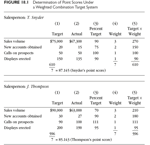 Figure 18.1 illustrates how performances, or point scores, are determined under a system incorporating both sales volume and activity goals. In this system, each of four different aspects of the sales job is weighted according to management’s evaluation of its relative importance. Column 1 shows the four targets making up the combination, and column 2 records actual performance data. Column 3, indicating the percentage of target achieved, is multiplied by the weighting factor in column 4 to yield the weighted performance in column 5. Finally, the column 5 total is divided by the column 4 total to determine each salesperson’s overall performance rating. Thus, Snyder’s rating is 87.145 percentage points (that is, 87.145 percent of the combination target) and Thompson’s is 85.143. Combination targets may also be designed without attaching different weights to the various components (which, of course, is the same as equally weighting all components), but in most cases, different weights are justified because all components are rarely of equal importance. In the example, had different weights not been used, management would have appraised Thompson’s performance as better than Snyder’s: 91 versus 88 percentage points. The reversal emphasizes the importance of selecting weights with care.