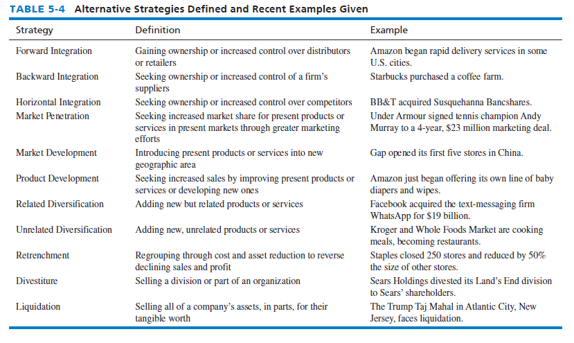 The model illustrated in Figure 5-1 provides a conceptual basis for applying strategic management. Defined and exemplified in Table 5-4, alternative strategies that an enterprise could pursue can be categorized into 11 actions: forward integration, backward integration, horizontal integration, market penetration, market development, product development, related diversification, unrelated diversification, retrenchment, divestiture, and liquidation. Each alternative strategy has countless variations. For example, market penetration can include adding salespersons, increasing advertising expenditures, couponing, and using similar actions to increase market share in a given geographic area.