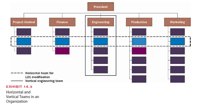 Formal teams are created by the organization as part of the formal organization structure. Two common types of formal teams are vertical and horizontal, which typically represent vertical and horizontal structural relationships. These two types of teams are illustrated in Exhibit 14.3. A third type of formal team is the special-purpose team.