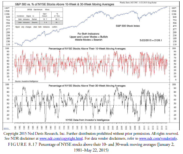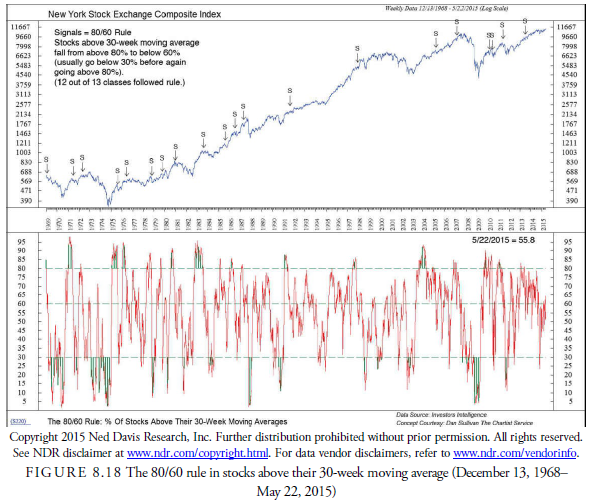 One interesting variation in the use of stocks above their 30-week moving average is the 80/60 rule. This rule states that when the percentage of stocks above their 30-week moving average has been greater than 80% and then declines below 60%, the percentage will decline to or close to 30%. In other words, a serious decline will likely follow such a signal. Figure 8.18 by Ned Davis Research, Inc. suggests that of the 20 instances of this occurring since 1968, 17 resulted in a general market decline.