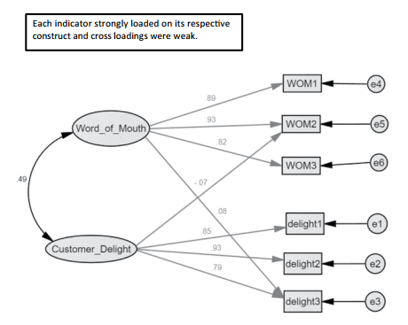 With model 52, there are no cross loadings, and the only paths included in the model are from the construct of Customer Delight to its three indicators and from Positive Word of Mouth to its three indicators.The regression weights are all strong, giving initial support that all the construct’s indicators are loading on their appropriate construct.