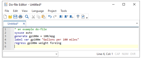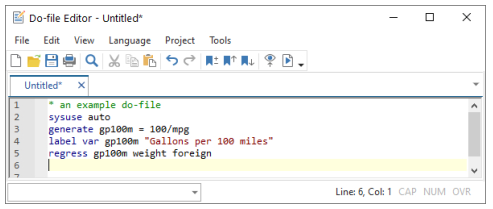 Stata comes with an integrated text editor called the Do-file Editor, which can be used for many tasks. It gets its name from the term do-file, which is a file containing a list of commands for Stata to run (called a batch file or a script in other settings). See [U] 16 Do-files for more information. Although the Do-file Editor has advanced features that can help in writing such files, it can also be used to build up a series of commands that can then be submitted to Stata all at once. This feature can be handy when writing a loop to process multiple variables in a similar fashion or when doing complex, repetitive tasks interactively.