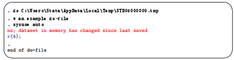 We can do this easily in Stata: simply save a text file containing the commands. When that is done, we can tell Stata to run the file and execute each command in sequence. Such a file is known as a Stata do-file; see [U] 16 Do-files.