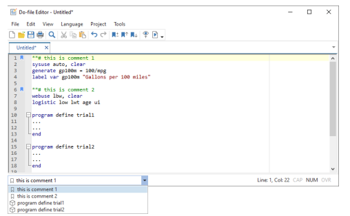 When working with long files, bookmarks allow you to easily navigate through your do-file. By placing a bookmark before important sections in your do-file, you can return to those sections more easily later. You can add a bookmark line by using Edit > Toggle bookmark, clicking the Toggle bookmark button on the toolbar, or by manually typing a line beginning with a special comment, **#. All other text on the rest of the line is treated as the title of the bookmark. You cannot have ado code on the same line as the bookmark comment, or the bookmark comment will be ignored.