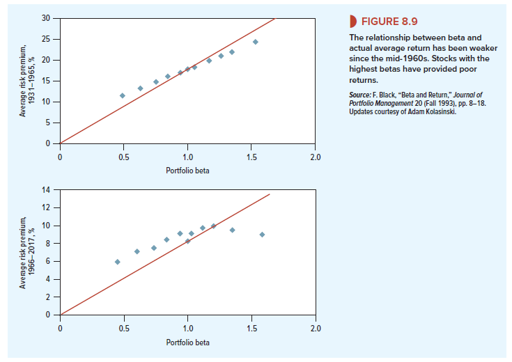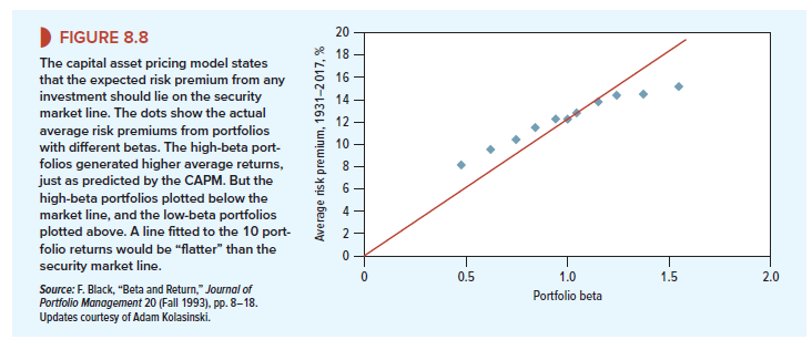 In time, the 10 investors all passed away, but their children agreed to meet in early 2018 in the same bar to compare the performance of their portfolios. Figure 8.8 shows how they had fared. Investor 1’s portfolio turned out to be much less risky than the market; its beta was only .48. However, investor 1 also realized the lowest return, 8.2% above the risk-free rate of interest. At the other extreme, the beta of investor 10’s portfolio was 1.55, about three times that of investor 1’s portfolio. But investor 10 was rewarded with the highest return, averaging 15.2% a year above the interest rate. So over this 87-year period, returns did indeed increase with beta.