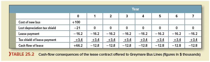 When we left Thomas Pierce III, president of Greymare Bus Lines, he had just set down in Table 25.2 the cash flows of the financial lease proposed by the bus manufacturer.