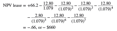 The lost salvage value is worth $10,000/(1.12)8 = $4,000. Remember that we previously calculated the value of the lease as -$660. The revised value is, therefore,-660 + 11,100 – 4,000= $6,550. Now the lease looks like a good deal.