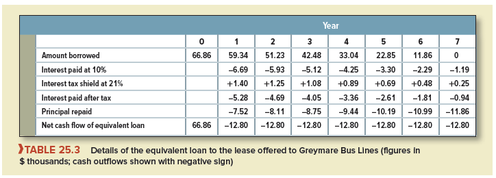 The lease payments are contractual obligations like the principal and interest payments on secured debt. Thus, you can think of the incremental lease cash flows in years 1 through 7 as the “debt service” of the lease. Table 25.3 shows a loan with exactly the same debt service as the lease. The initial amount of the loan is $66.86 thousand. If Greymare borrowed this sum, it would need to pay interest in the first year of .10 X 66.86 = 6.69 and would receive a tax shield on this interest of .21 X 6.69 = 1.40. Greymare could then repay 7.52 of the loan, leaving a net cash outflow of 12.80 (exactly the same as for the lease) in year 1 and an outstanding debt at the start of year 2 of 59.34.