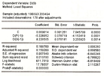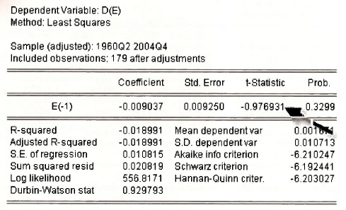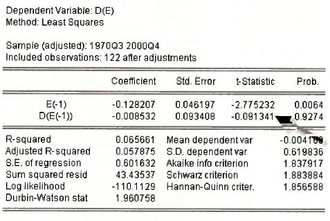 As an aside, extra lags of the dependent variable (for example d(e(-1)) were not introduced in the test equation above, as they were insignificant. See for example the case below.