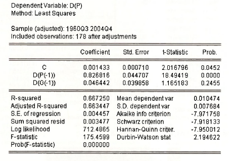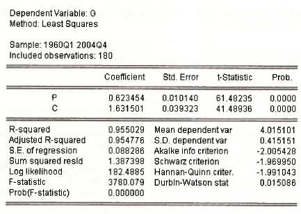 The results in the text were based on data contained in the EViews workfile growth.wfl. The variables are G (log of GDP) and P (log of the CPI). To check whether the variables are cointegrated or spuriously related, we need to test the regression residuals for stationarity. To do this, first estimate the following least squares equation.