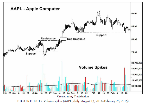 Usually there is a reason for a volume spike, but the reason for the spike might be unrelated to the technical issues of price trends and behavior. Of course, heavy trading might be related to a news announcement made about the company. Or heavy trading volume in a stock can occur if the stock is a component of an index or basket that had a large institutional trade that day. Options expiring can also influence volume figures. In all spikes, any outside reason must first be investigated because it might have nothing to do with the issue’s trend and price behavior.