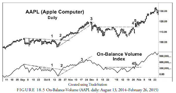 Let us look a little more closely at Figure 18.5. During September and early October 2014, a downward trend existed in both prices and the OBV. The OBV had a minor breakout upward at point 1, but the price did not confirm that breakout with one of its own. The suggestion was that the price was not ready to change trend direction. At point 2, however, both the OBV and price broke upward through their declining trend lines in a legitimate and confirmed breakout and initiated a month-long upward price trend. This demonstrates the importance of having confirmation from price when a signal is given by an index (or oscillator). At point 3, the OBV broke below its rising trend line signaling the volume was not keeping up with price. Nevertheless, price did not break its upward trend line to confirm this weakness until point 3 on the price chart, and it broke with a vengeance. During December and most of January, the price and OBV trend was flat. A small upward breakout occurred in the OBV at point 4 that was not confirmed by price until two days later when both the OBV and price broke upward on the same day, thus confirming each other’s action. OBV is thus valuable in assessing the legitimacy of trend breakouts, and in this example actually led price breakouts, giving the analyst warning to watch for a directional change.