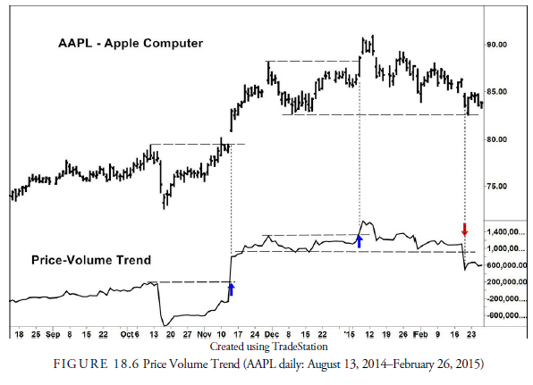 In Figure 18.6, notice that this method, using the same data as Figure 18.5, shows the price-volume trend confirming only after the upward gap breakout in November. In January, the Price-Volume Trend breakout above resistance coincides with a breakout in prices. And in February, the breakdown below support precedes a longer decline that doesn’t begin until two weeks later with an equivalent breakdown in price.