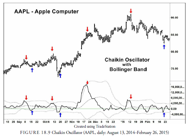 Figure 18.9 shows how well the Chaikin Oscillator signals short-term reversals within a trading range. The overbought and oversold levels in the chart are determined by a standard Bollinger Band. When the overbought (upper) band is broken from the outside, a sell signal is generated, and conversely when the oversold (lower) band is broke from the outside, a buy signal is generated. The narrowing of the bands shows a decline in volatility. Declining volatility precedes significant price moves and is, thus, a warning of change in direction if not intensity.