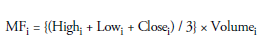 Another method of measuring money flow into and out of a stock is the Money Flow Index (MFI). It considers “up” days and “down” days to determine the flow of money into and out of an equity. The money flow on any particular day is the day’s typical, or average, price multiplied by the daily volume. The day’s typical price is determined as the average of the high, low, and close. Therefore, money flow on Day i would be calculated as