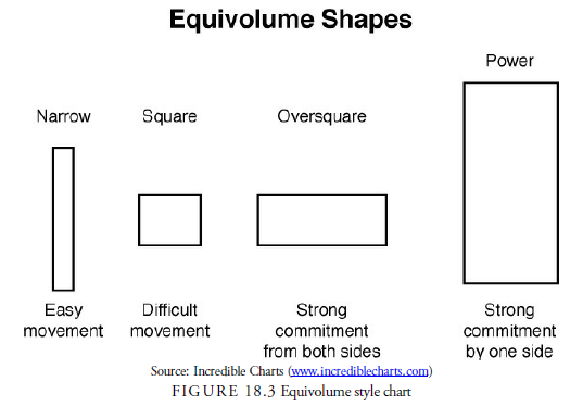 Arms first interpreted the Equivolume charts by considering the rectangular shapes displaying the price range by the height of the rectangle and the volume by the width. For example, after a strong upward trend, the formation of a box shape or flat rectangle suggested little price motion but heavy volume. This would indicate that the trend was meeting some heavy resistance. Arms also found that the standard patterns used in bar chart analysis occur in Equivolume charts, and interestingly, trend lines and channel lines appeared to work as well. One would think that a trend line was totally price- and time-related in a bar chart, but Arms demonstrated that trend lines in price-to-volume also occur.